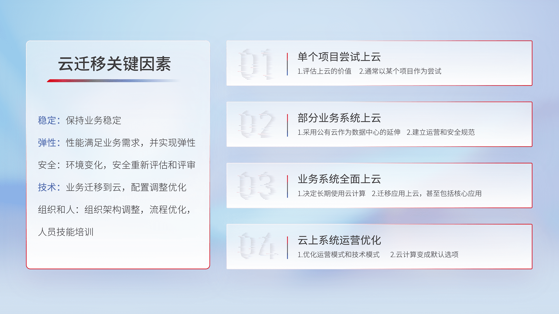 结合实际业务,,,从规划设计、、云平台选型、、、、云原生改造、、、、数据迁移、、、、集成交付,,迁移全过程为客户识别最佳上云路径,,,,做好风险识别管理,,,,设计网络架构、、、、身份权限、、、、安全审计合规、、、、操作审计、、、日志审计、、监控告警策略、、、、多站点容灾设计等,,,对云上基础设施进行整体规划,,提升IT治理水平,,,,以满足弹性、、、、高可用、、高性能的需求。。。。